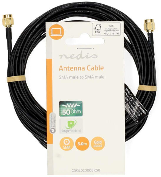 A Nedis CSGL02000BK50 5 méteres SMA kábel aranyozott csatlakozókkal ideális antennák, modemek, routerek vagy más RF-eszközök összekapcsolásához. 50 Ohmos impedanciával és tartós PVC burkolattal.